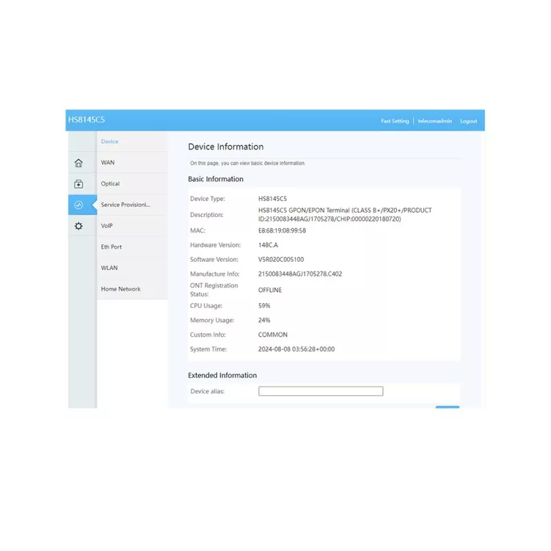 GPON технологиясын қолдана отырып, ол үйлер мен шағын кеңселерге ультра кең жолақты қолжетімділікті қамтамасыз етеді. Бір POTS портымен, бір Gigabit Ethernet (GE) портымен және Wi-Fi портымен бірге үш Fast Ethernet (FE) автоматты бейімдеу порттарымен жабдықталған бұл әр түрлі құрылғылар үшін үздіксіз қосылымды қамтамасыз етеді.